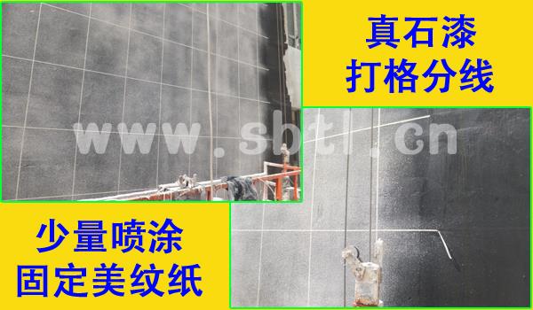 在真石漆施工時(shí),打格分線(xiàn)是很重要的環(huán)節(jié);但大風(fēng)天氣時(shí),美紋紙很難固定。解決的辦法也很簡(jiǎn)單,在貼上美紋紙后,迅速少量的噴上一次薄薄的真石漆,會(huì)起到很好的固定作用。
