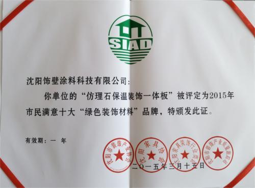 沈陽飾璧涂料科技有限公司在遼沈家具裝飾行業(yè)參選的500多家企業(yè)中脫穎而出,得到了行業(yè)和消費(fèi)者的一致認(rèn)可,獲得了“10大綠色裝飾材料品牌”的殊榮。
