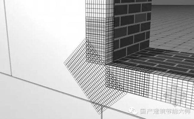 6,拐角部位,網(wǎng)格布要保持連續(xù)性,并從兩邊雙向繞角,包墻寬度陽(yáng)角處不小于200mm,陰角處不小于100mm