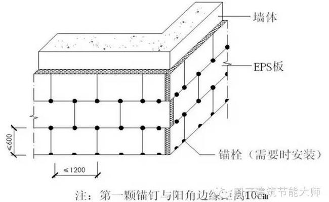 以涂料為外飾面時(shí),錨栓可安裝在EPS板上。錨栓安裝應(yīng)在膠粘劑干燥24h后進(jìn)行。在抹面砂漿在未硬化的狀態(tài)時(shí)安裝錨栓,會(huì)比較方便,玻纖網(wǎng)格布也不會(huì)發(fā)生起皺、拉扯等現(xiàn)象。如過(guò)晚打入錨栓引起錨盤周圍防護(hù)面層有細(xì)微裂紋,如有細(xì)微裂紋應(yīng)立即涂抹抹面砂漿修補(bǔ),并酌情埋入網(wǎng)格布。