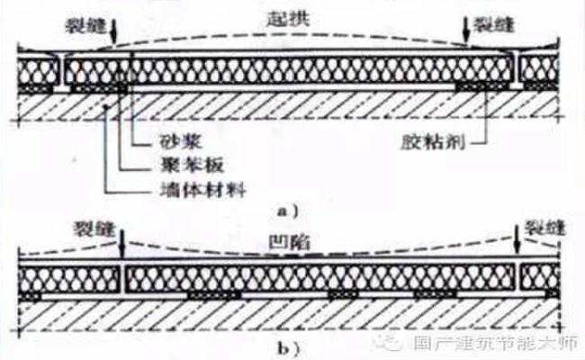 平整度超過(guò)5mm/2m時(shí),應(yīng)采用點(diǎn)框法施工。首先用抹灰刀沿保溫板周邊將粘膠均勻地涂到保溫板邊緣上,然后在板面上再均勻地分布六至多個(gè)粘結(jié)點(diǎn)。粘結(jié)點(diǎn)的厚度視墻面的平整度而定。平整度越差,粘結(jié)點(diǎn)越厚。一方面是為了保證保溫板在基底上有一個(gè)足夠的粘結(jié)強(qiáng)度;另一方面是為了避免保溫板中心部位的凸起。并造成保溫板連接處出現(xiàn)裂縫。如下所示,都是這類裂縫。