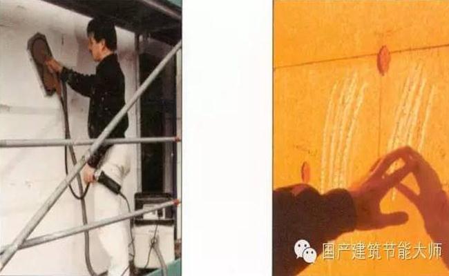 注意:EPS板表面不得長(zhǎng)期裸露,EPS板安裝上墻后應(yīng)及時(shí)做防護(hù)面層。EPS板在經(jīng)過(guò)數(shù)周的太陽(yáng)曝曬后,表面會(huì)發(fā)生粉化、變黃的老化現(xiàn)象,應(yīng)盡早覆蓋防護(hù)面層。一旦產(chǎn)生粉化、變黃現(xiàn)象后,需用打磨砂紙將已老化的表層打磨掉,并掃除粉屑。