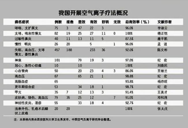 自上個世紀,我國醫(yī)學界就已經(jīng)開始探索負氧離子對人體多種疾病的治療,并將其應(yīng)用到臨床上,取得了非常理想的效果。下圖是西安醫(yī)科大學衛(wèi)生系發(fā)布,中國空氣負離子研究學會整理的關(guān)于我國開展空氣離子療法的概況。由此可知,我國已經(jīng)將負氧離子療法應(yīng)用于人體多種疾病的緩解與治療上,效果也非常之理想。負氧離子療法用于多種疾病的治療,可有效降低諸多藥物對患者身體產(chǎn)生的副作用與損害,同時提高疾病治愈率,減少患者的痛苦。