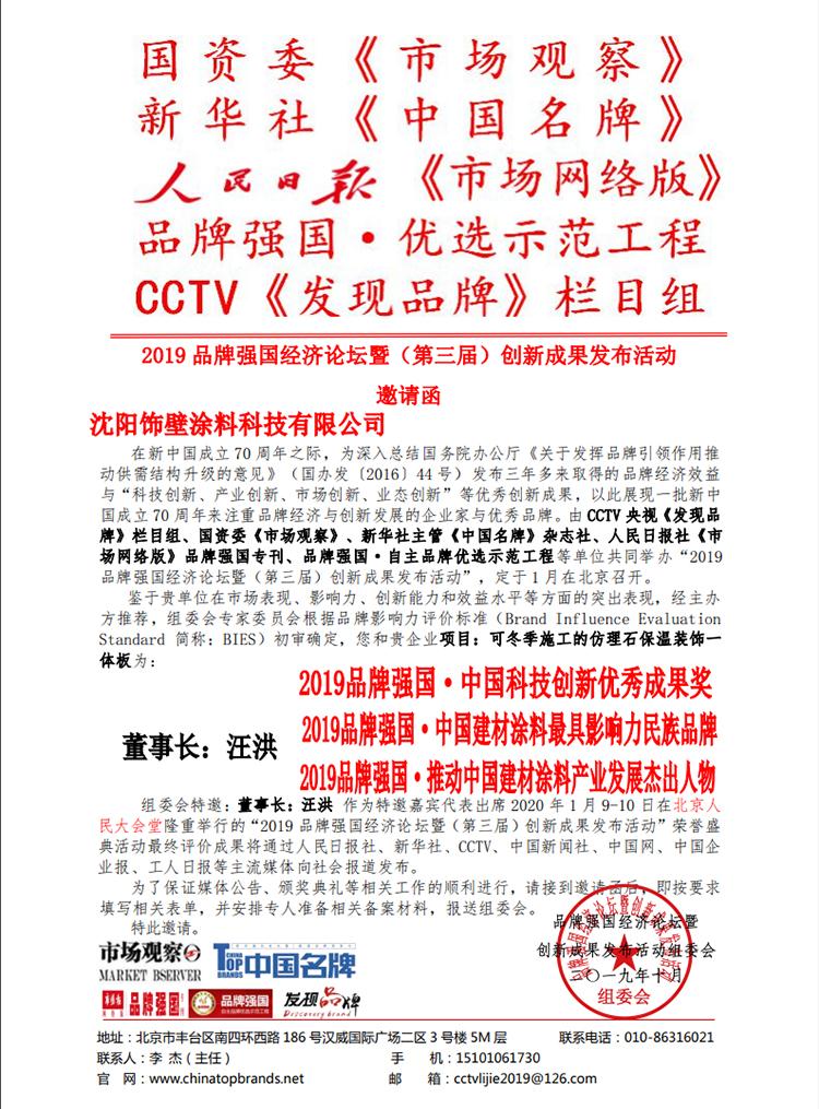 經(jīng)組委會(huì)特邀,沈陽(yáng)飾壁涂料科技有限公司董事長(zhǎng)汪洪將作為特邀嘉賓代表出席本將次活動(dòng)。鑒于飾壁科技在市場(chǎng)表現(xiàn)、影響力、創(chuàng)新能力和效益水平等方面的突出表現(xiàn),組委會(huì)專家委員會(huì)經(jīng)過(guò)初審,認(rèn)為該企業(yè)項(xiàng)目“可冬季施工的仿理石保溫裝飾一體板”符合為2019品牌強(qiáng)國(guó)·中國(guó)科技創(chuàng)新優(yōu)秀成果獎(jiǎng)、2019品牌強(qiáng)國(guó)·中國(guó)建材涂料最具影響力民族品牌、2019品牌強(qiáng)國(guó)·推動(dòng)中國(guó)建材涂料產(chǎn)業(yè)發(fā)展杰出人物等標(biāo)準(zhǔn)。